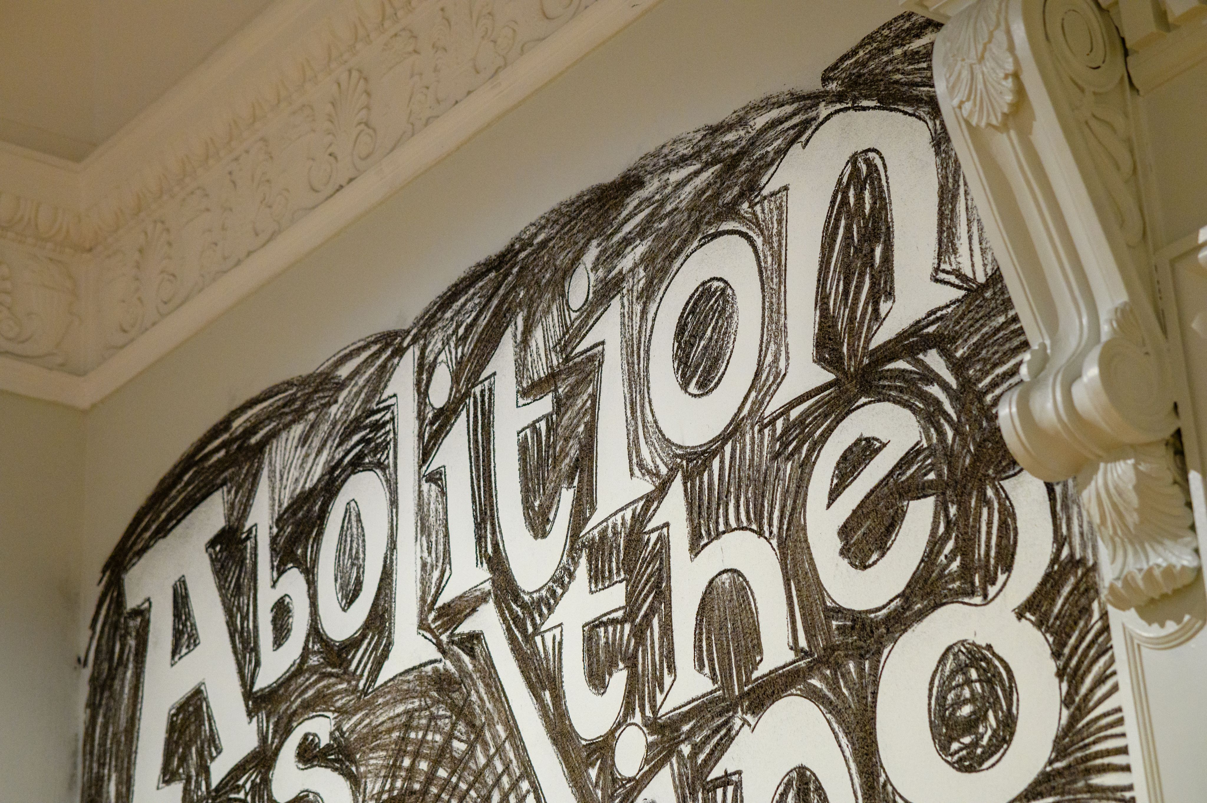 Drawn directly on the gallery walls, Study references Stefano Harney and Fred Motens’ 2013 book The Undercommons: Fugitive Planning and Black Study. The text critiques academia, public policy and capitalist society. The artist’s use of charcoal is symbolic, linked to their interest in the intersections of race, colonialism, climate change and the environment. The artist describes charcoal as ‘material blackness carving into the fabric of the institution.’ In 2023, the artist launched ‘Soul of Fire Artists’ Charcoal’, a chunky, handmade charcoal, ideal for use by artists, that is made using salvaged wood.