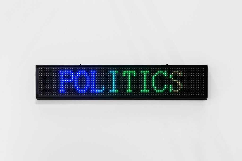 This bright LED artwork looks like the sort of sign commonly seen in shop windows. Its familiar appearance clashes with the word that illuminates it. Politics can feel like an abstract concept, disconnected from our daily lives, but this artwork reminds us of the link between the two.
