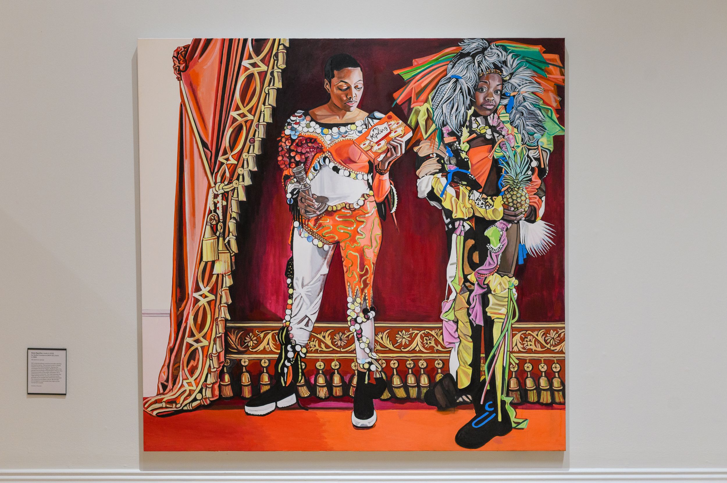 QC’s interdisciplinary practice includes painting and performance. This picture is one in a series made for their 2023 exhibition Teasing Out Contingencies at the Higgins, Bedford. Set in the opulent surroundings of Buckingham Palace, they feature portraits of the public dressed in QC’s performance costumes. The clash between this regal setting and the carnival-inspired outfits prompts us to consider the relationship between the monarchy and Black culture. We are also encouraged to contemplate the origins of the monarchy’s wealth.
