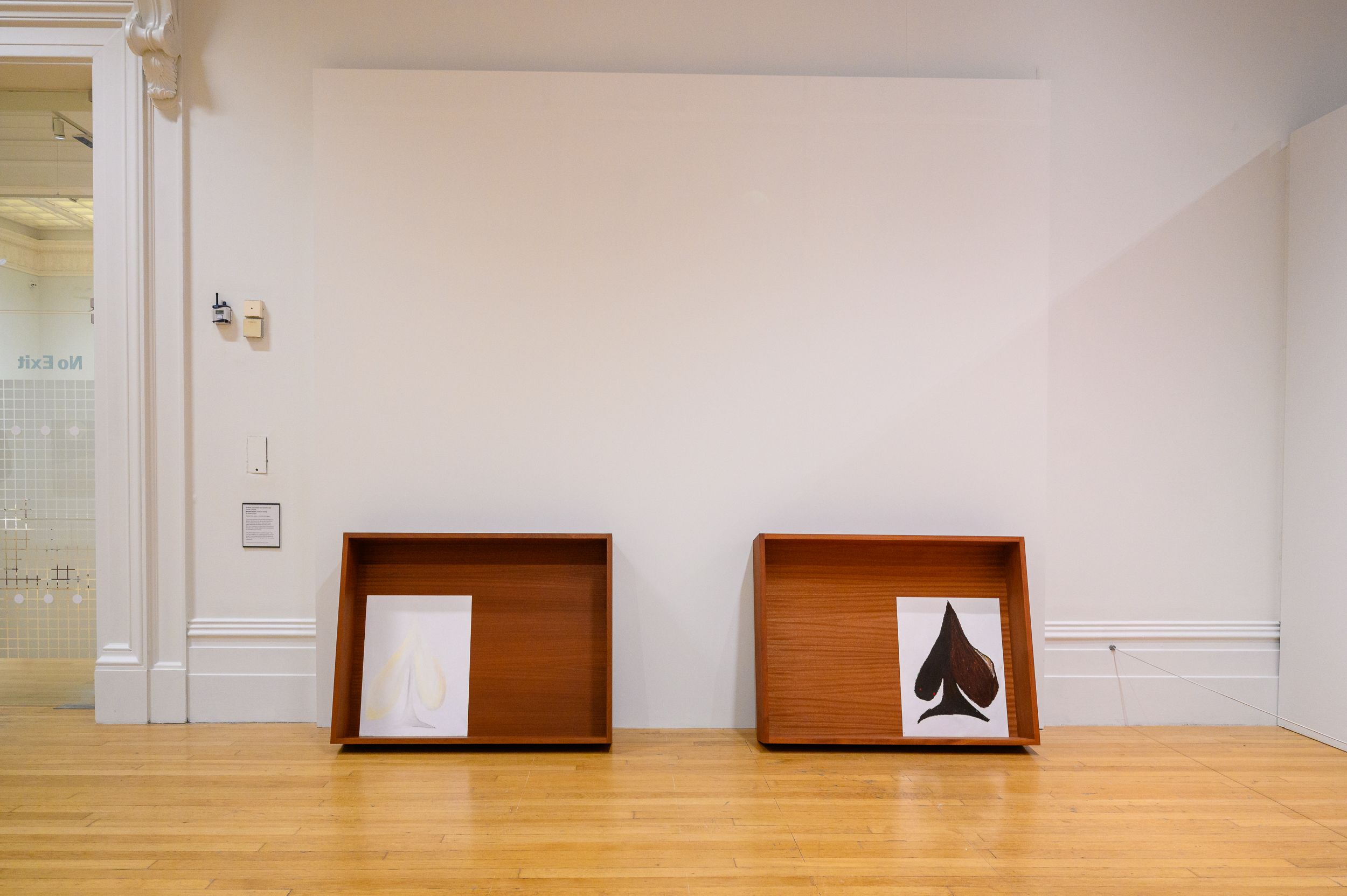 These two wooden frames hold paintings of a spade, referring to the racist use of the term. It was used specifically to describe those associated with the Windrush Generation. The form reappears across Dillon’s practice to reclaim it as a shield and symbol of protection for the Black community.