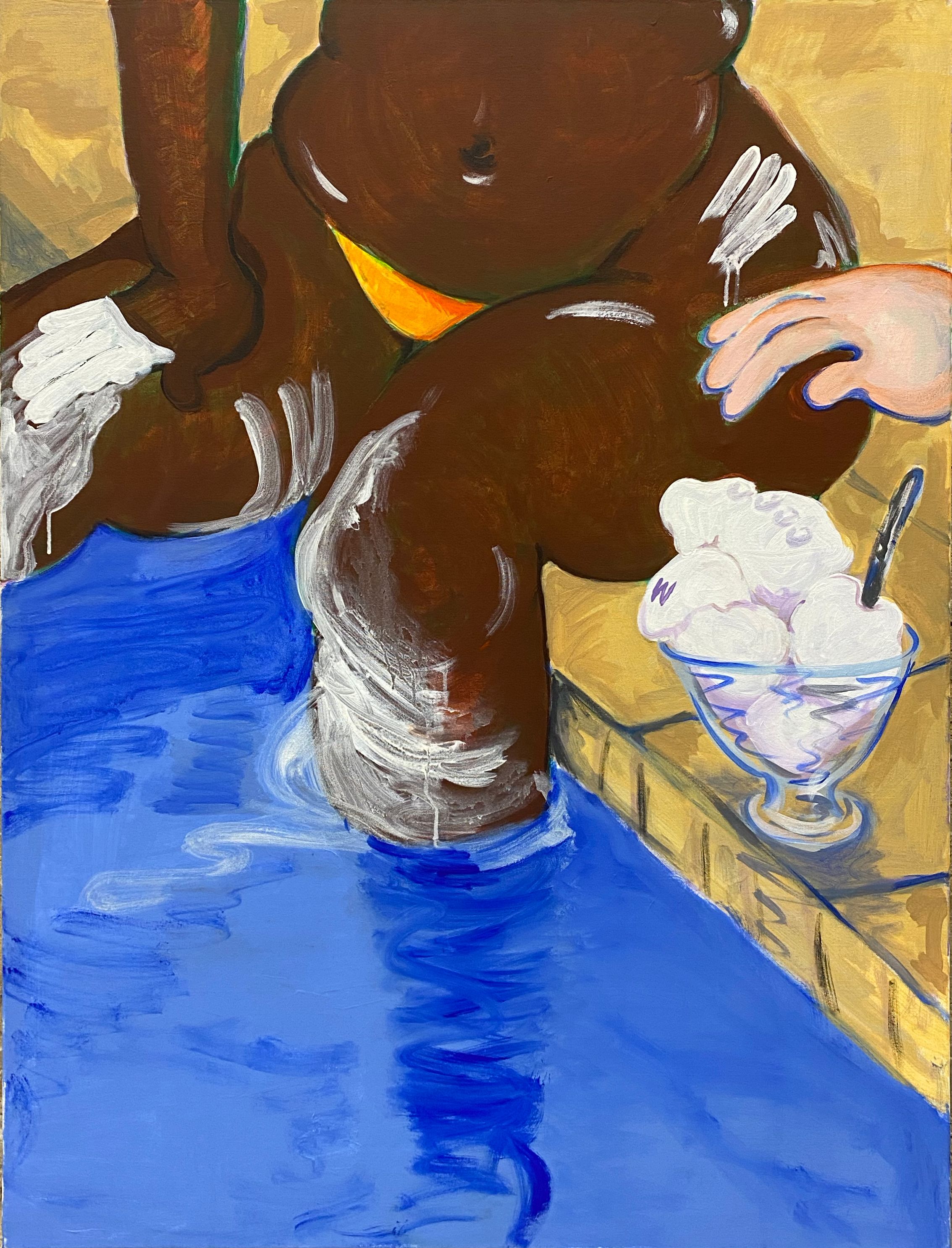 In this painting, a Black woman sits with her legs in a swimming pool, next to a bowl of white ice cream. It is one in a series made by the artist that uses food to explore ideas about whiteness and white supremacy. It is unclear whether the white marks on the woman’s body are sun cream or ice cream, applied to make herself whiter to meet Western beauty standards that favour light skin.