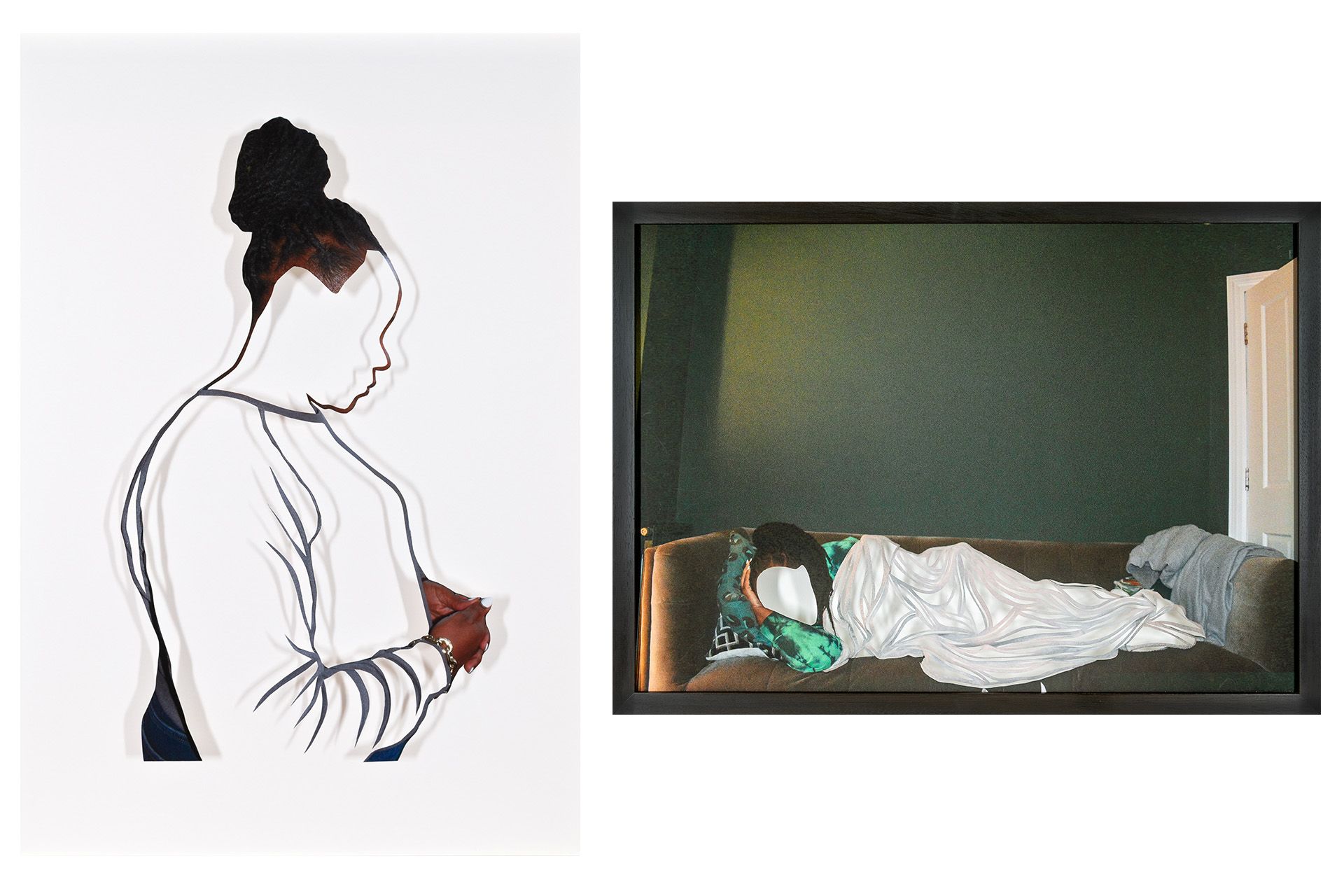 This artwork is a self-portrait, showing the artist in a moment of rest. They are depicted lying on a sofa. In keeping with the artist’s characteristic technique, their face has been cut-away.