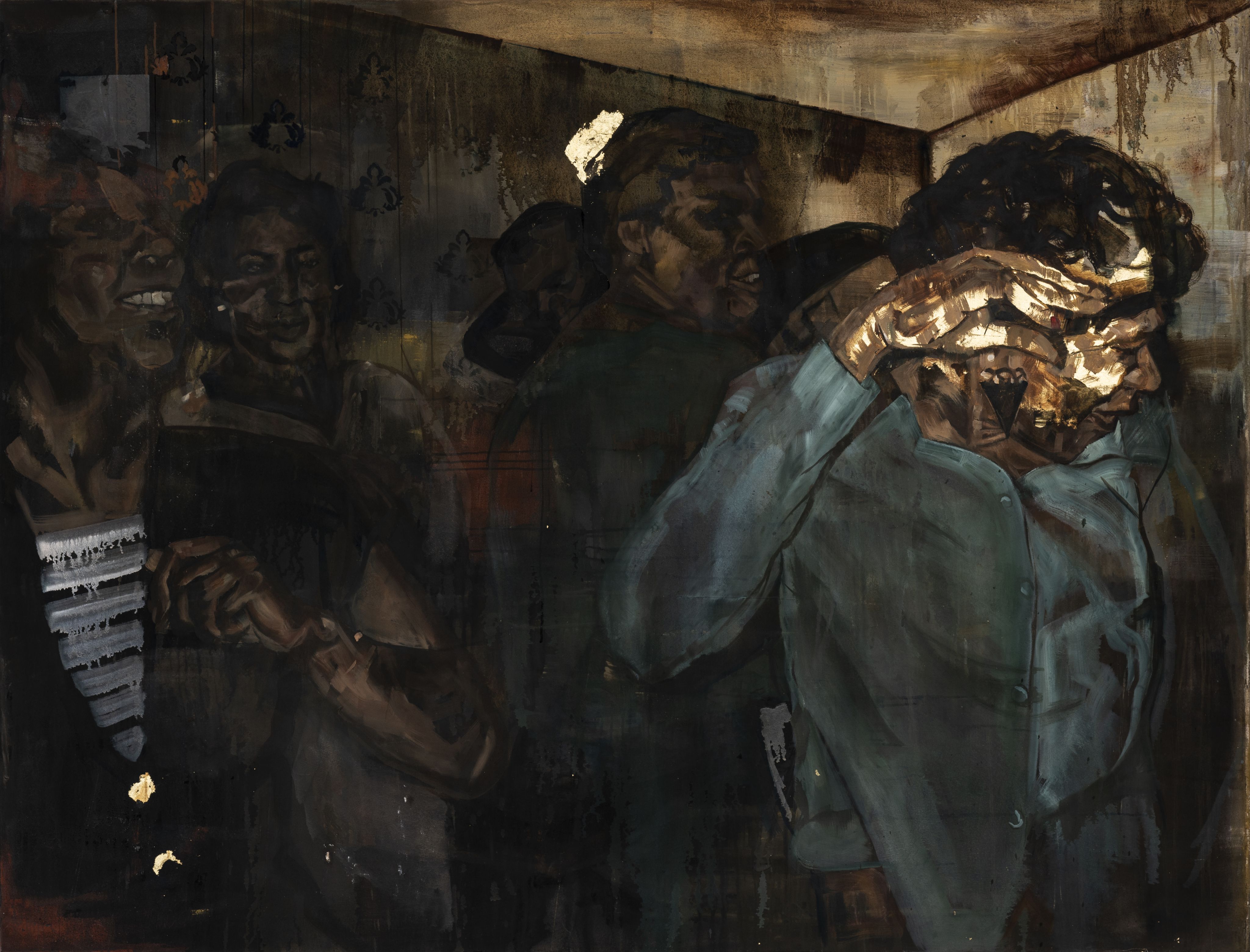 Go Liming, Oil paint, acrylic, iron powder, print and imitation gold leaf on canvas, 2022