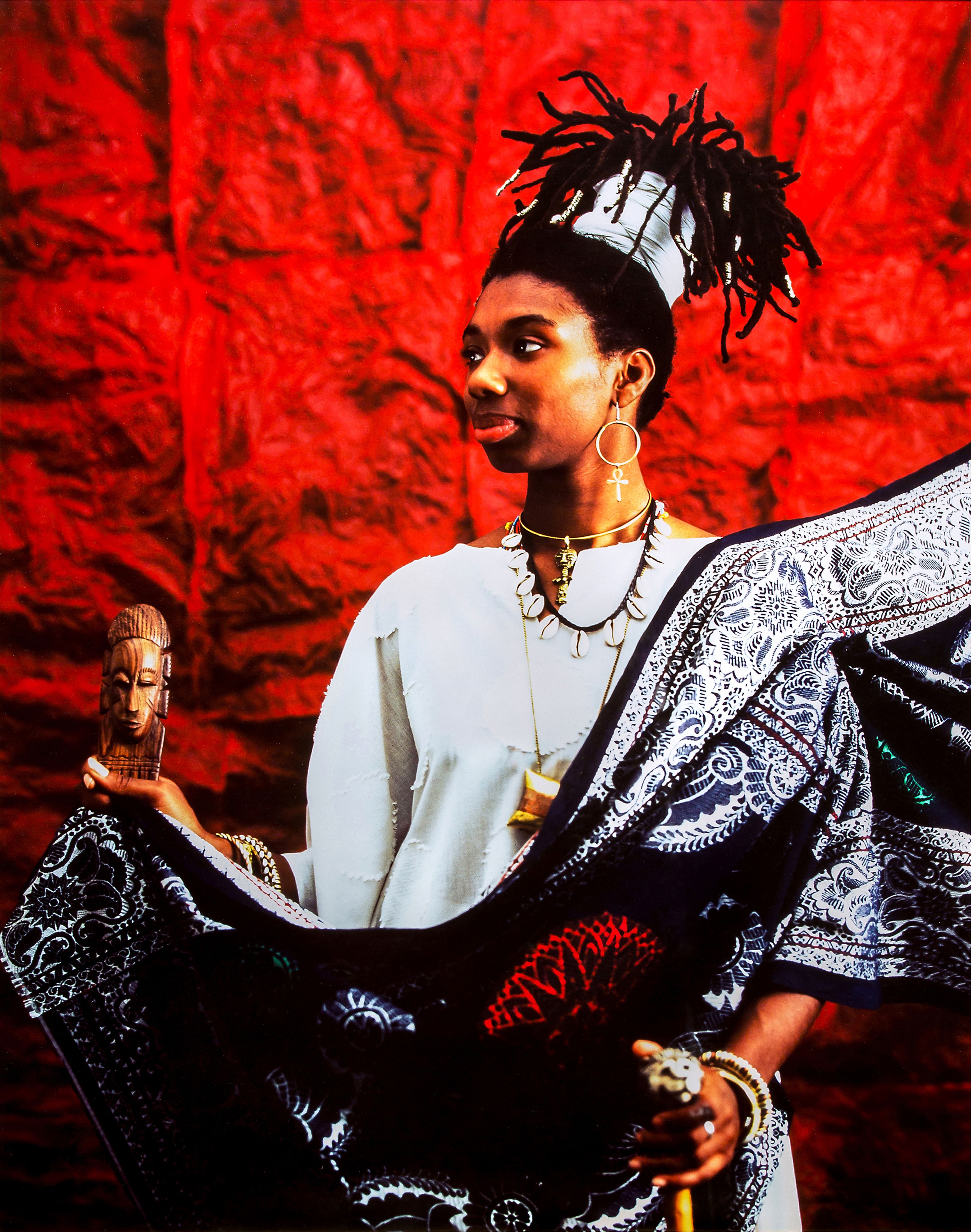 This photograph is from the artist’s series ‘ZABAT’. It includes nine photographs based on the Muses of Ancient Greece, goddesses of the arts and sciences, typically depicted as white women throughout art history. Sulter’s photographs instead feature creative Black women. This is a portrait of the poet Dorothea Smartt (born in 1963).