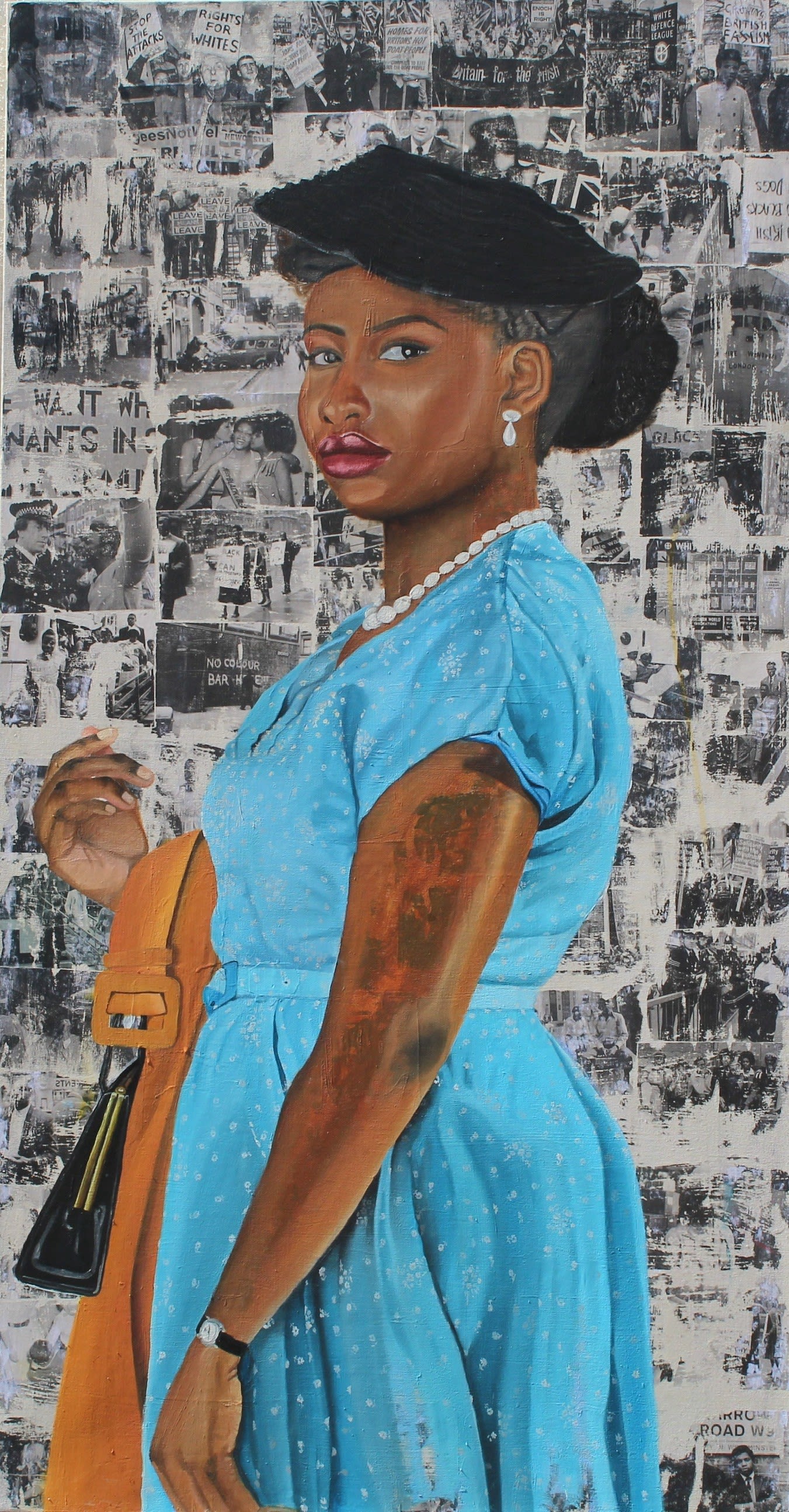 The background for this painting is a photo transfer collage made of images found in online archives. They relate to far-right protests and riots linked to the Windrush Generation, including both scenes from the 1950s and present day. The painted figure is based on a photograph of the artist, dressed in 1950s style clothing, contemporaneous to the Windrush’s arrival.