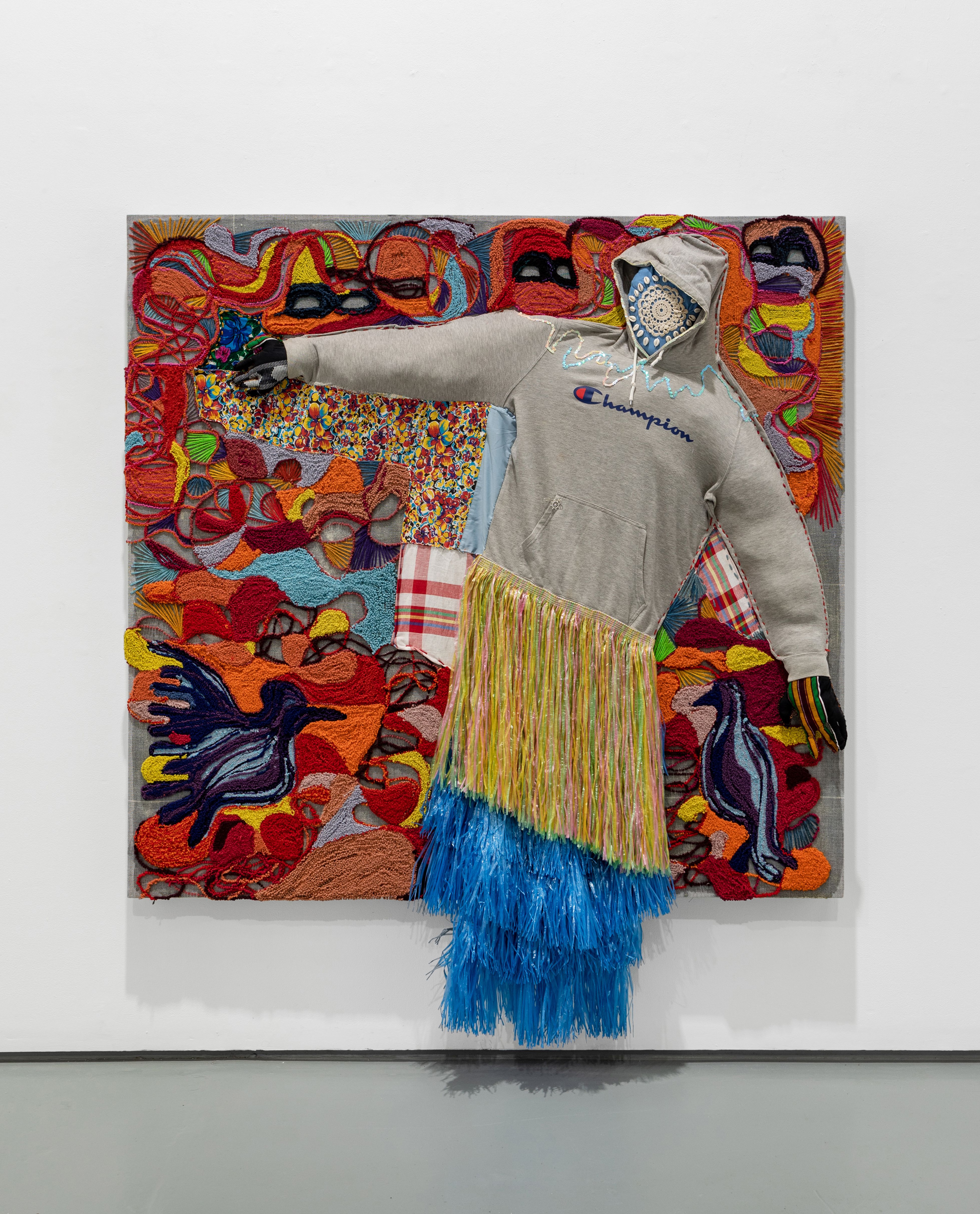 Tracing Shadows Amongst The Crows, Raffia, acrylic, cotton, doilies, hooded sweatshirt, wool, felt, sequins, Florida Water and Bay Rum on linen, 2022